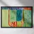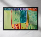 Een abstract kunstwerk dat lijkt op een lappendeken, met verschillende rechthoekige kleurvlakken: blauwe en witte verticale strepen, effen groen en licht geelgroen, mogelijk een gestileerd kustlandschap.