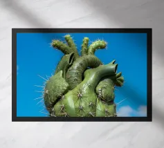 Een grillig beeld van een rode ballon, delicaat neergestreken op een stekelige cactus, tegen een felblauwe lucht. De speelse juxtapositie van breekbaarheid en gevaar creëert een opvallend en surrealistisch visueel concept.