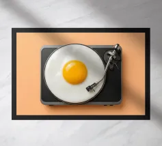 Deze foto toont een platenspeler in vintage stijl met een helder en minimalistisch ontwerp. De platenspeler is overwegend blauw en heeft een matte afwerking, en er ligt een lichtroze plaat op de platenspeler. De toonarm, die zich aan de rechterkant bevindt, is ook perzikkleurig met beige accenten en er loopt een zwarte kabel langs. De achtergrond is een neutrale gebroken witte kleur die de zachte pasteltinten van de platenspeler aanvult. De algehele esthetiek is modern met een vleugje retro en combineert zachte kleuren.