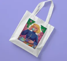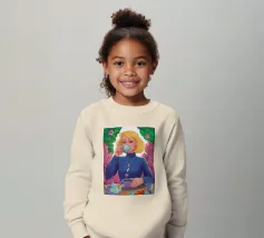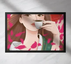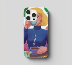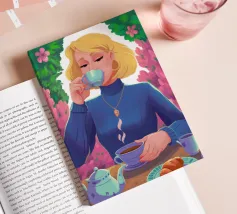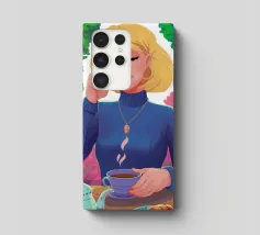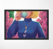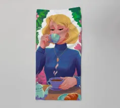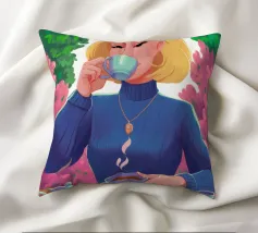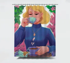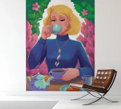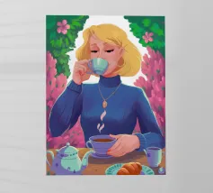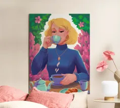 A portrait of a chic blonde woman in a blue turtleneck, enjoying a cup of tea. Her serene expression and the cozy atmosphere create a moment of elegant and peaceful repose.