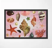 Vintage collection of all types of shells and other bits from the ocean, including pearls, snails, corals, mussels, oysters, etc. over a photo of a pink sunset on the beach. Beautiful nostalgic retro collage by MsGonzalez