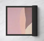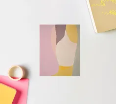Schilderij in minimalistische stijl met losse penseelstreken in zachtroze, lila en geel. Het gestileerde achteraanzicht van een vrouwenlichaam tegen een zachte achtergrond van grijs, licht lila en donkerbeige straalt rust en elegantie uit.