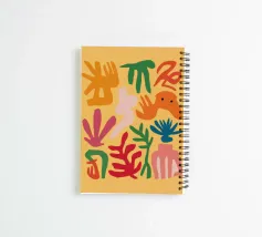 Een speelse en vrolijke abstracte compositie van verschillende organische, vloeiende vormen, bladeren en handmotieven in een helder palet van oranje, beige, blauw en rood.