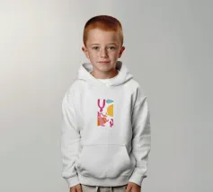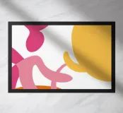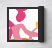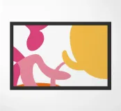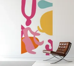 Een levendige abstracte compositie van roze, gele en rode vormen die over het doek lijken te dansen. Het werk wordt gekenmerkt door zijn speelse energie, eenvoudige vormen en levendige, vrolijke kleurenpalet.