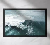 Een surfer berijdt de rollende golven met balans en gratie. Hij staat stevig op zijn board terwijl de energie van de oceaan hem voortdrijft en zowel vrijheid als avontuur belichaamt.