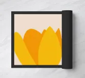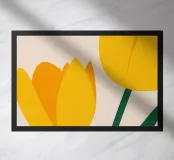 Twee prachtige gele tulpen zijn geïllustreerd in een eenvoudige, elegante en moderne stijl tegen een neutrale achtergrond, die de klassieke schoonheid van de bloem viert.