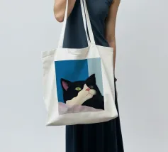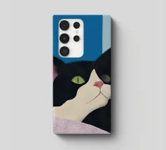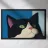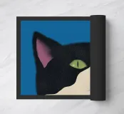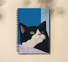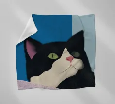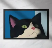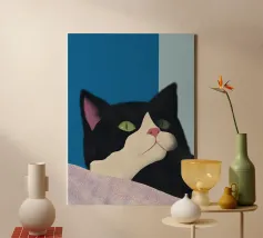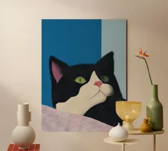 Een zwart-witte kat met groene ogen kijkt omhoog, zijn roze neus voegt een vleugje contrast toe. De achtergrond bestaat uit opvallende blauwe en lichtblauwe blokken die de serene uitstraling van de katachtige versterken.