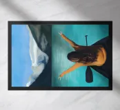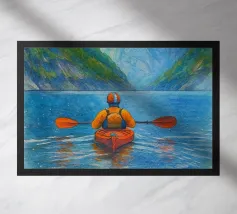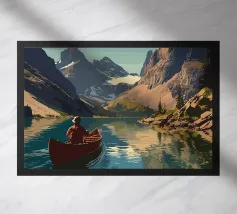 Uplifting digital painting of a woman in a canoe, arms raised in peace, surrounded by turquoise waters and majestic snow-capped mountains. This serene landscape captures freedom, stillness, and connection to nature. Perfect for adventure lovers, travel decor, and tranquil spaces. Ideal wall art for bedrooms, living rooms, or cabins. A beautiful gift for explorers, dreamers, and fans of mindful, scenic escapes