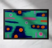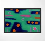 Abstract schilderij met een levendige compositie van vormen en kleuren. De achtergrond is een textuurmix van groene tinten, die een illusie van diepte creëert. Verspreid over het doek staan gedurfde oranje cirkels, sommige effen en andere met alleen contouren, die scherp afsteken tegen het groen. Onderbroken roze streken voegen warmte toe aan het tafereel, terwijl paarse stippellijnen voor een speels ritme zorgen. Een paar eenzame grijze cirkels lijken te zweven in dit dromerige landschap. Dit kunstwerk roept een gevoel van grilligheid op door het gebruik van kleurcombinaties en gevarieerde geometrische vormen.