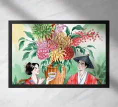 Twee mensen gekleed in traditionele kleding genieten samen van een maaltijd aan een tafel versierd met bloemen en fruit.
