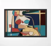 This artwork depicts a figure in a joyful dance, surrounded by geometric shapes and vibrant colors. The composition highlights the exuberance and energy of the scene.