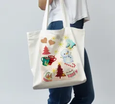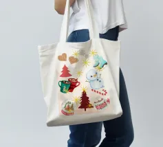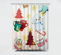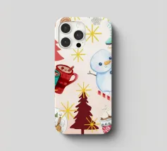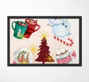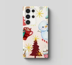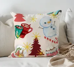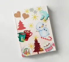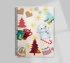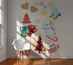 Een speelse, kerstachtige illustratie in aquarelstijl met leuke motieven zoals een sneeuwpop, schaatsen, kopjes warme chocolademelk, zuurstokken, harten van peperkoek en dennenbomen. Gouden sterretjes en sneeuwvlokken liggen losjes verspreid over de lichte achtergrond, waardoor de scène een warme, gezellige winter- en kerstsfeer uitstraalt.