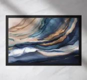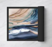 Horizontale golven van zachtbruin, crèmekleurig en diepblauw doen denken aan door de wind gebeeldhouwde kustlijnen.