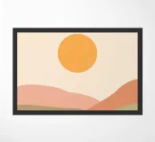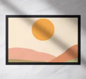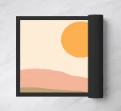 Dit kunstwerk vangt de serene schoonheid van glooiende heuvels badend in warme, aardse tinten, met een zachte zon die boven je hoofd schijnt. De minimalistische stijl en het gedempte kleurenpalet creëren een kalme en gezellige sfeer, perfect om een vleugje magie van het gouden uur in elke ruimte te brengen.