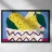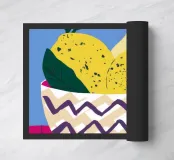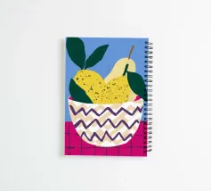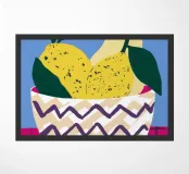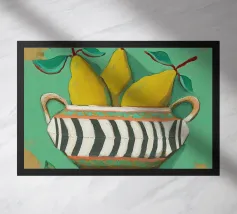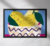 Twee gele peren rusten in een roze en witte schaal met zigzagpatroon, met een opvallende gele en donkere achtergrond die een contrastrijk, grafisch stilleven creëert.