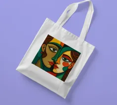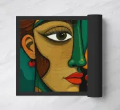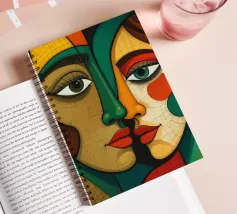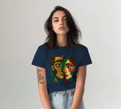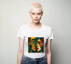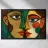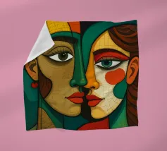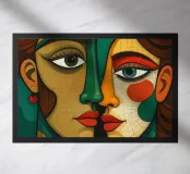 Dit abstracte kubistische kunstwerk toont twee gezichten die samensmelten in levendige kleuren. Perfect als moderne muurschildering voor liefhebbers van expressionistische kunst.
