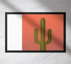Een gestileerde cactus met drie armen en stekelige details staat rechtop. Aan de basis voegt een oranje plant een contrasterende kleur toe.