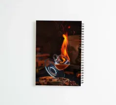 koffie glazen beker vuur vlam kaneelstokjes koffiebonen houten blok warme verlichting vonken reflecties oude molen donkere achtergrond drank rook warmte drijvend actie koffiezetten keuken houten tafel