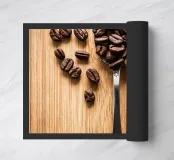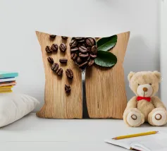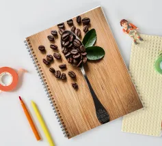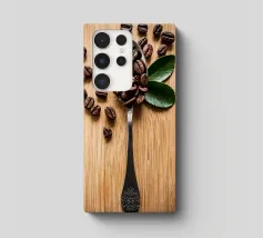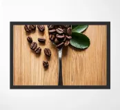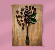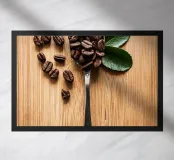 koffiebonen lepel houten oppervlak bladeren arrangement zilverwerk textuur natuurlijke elementen cafeïne houtnerf boon stilleven keuken biologisch koken tafelschikking eenvoudige compositie huisdecor culinair ontbijt
