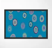 In this print titled "Orbs Dance" artist Helen Joynson invites viewers into a mesmerizing world of abstract beauty. With her unique blend of illustration and graphic design, Joynson creates a vibrant and colorful composition that is both visually striking and emotionally evocative. The artwork showcases an explosion of vivid hues, as if the colors themselves are engaged in a lively dance. Against a serene blue background, brush strokes come alive with energy and movement, forming intricate patterns that seem to ripple across the surface.