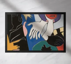 Dit kunstwerk toont een dynamisch abstract personage met gedurfde lijnen en een mix van rode, blauwe en witte kleuren. De achtergrond is gevuld met abstracte vormen en patronen, wat bijdraagt aan het algehele dynamische thema.