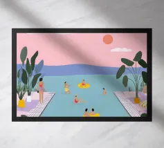 Zonlicht filtert door tropische bladeren terwijl ze vredig in een zwembad drijft, helemaal op haar gemak. De wereld om haar heen vervaagt in zachte kleuren en rustige vormen - strandballen, sandalen en de tijd zelf blijven achter. Dit werk is een visuele uitademing en herinnert je eraan om te pauzeren, adem te halen en rust genoeg te laten zijn.