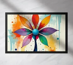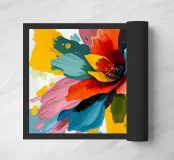 This vibrant abstract painting features a dynamic, multi-petaled flower bursting with an array of bold colors including deep blues, rich reds, bright yellows, energetic oranges, and soft pinks. The brushstrokes are loose and expressive, with visible textures and splatters of paint, creating a sense of movement and spontaneity. A dark, almost silhouetted stem grounds the kaleidoscopic explosion of color, while hints of white and muted background tones allow the vivid hues to truly pop. The overall impression is one of joyful energy and abstract floral beauty.