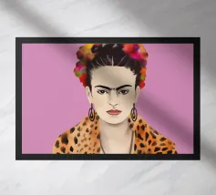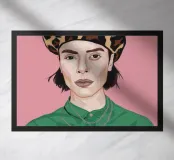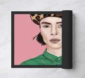 This artwork depicts a person with short hair wearing a leopard print hat and a green shirt. The background is pink, highlighting the graceful and stylish appearance of the subject.