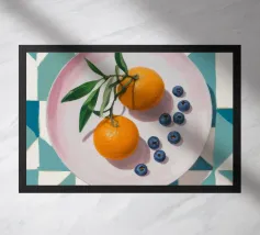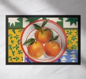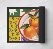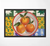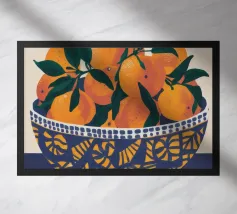 Mandarijnen in een glazen schaal op een doek met geometrisch patroon combineren frisheid en gedurfdheid.