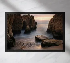 Het water weerspiegelt de kleuren als een spiegel, het oppervlak gloeit met zacht, kabbelend licht. Zachte golven rollen naar de kust en vangen de laatste stralen van de dag op. De lucht voelt stil en vredig, gevuld met het kalmerende ritme van de zee. Het is een stil, adembenemend moment waar lucht en oceaan samensmelten tot één warm, gloeiend tafereel."