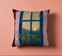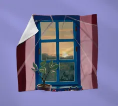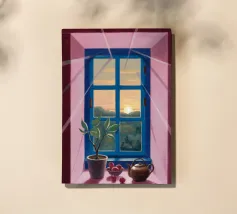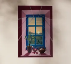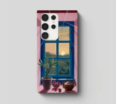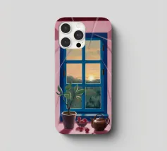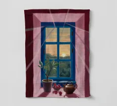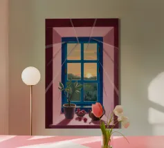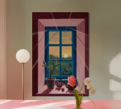 A tranquil scene of two cups of tea on a windowsill, with a view of a beautiful sunset through the window. The composition is peaceful, romantic, and captures a perfect, quiet moment.