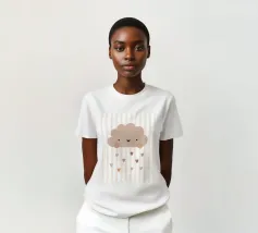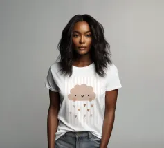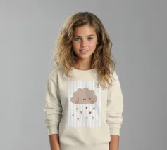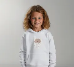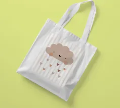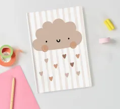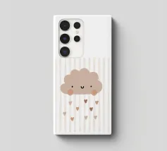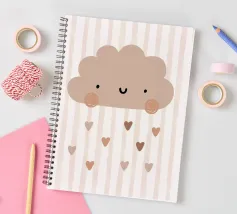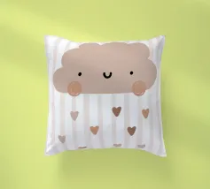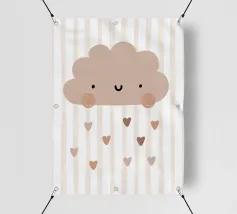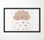 Dit zachte, minimalistische kunstwerk toont een lachende wolk die kleine hartjes laat regenen. Schattige kunst, kinderdecoratie, geluk