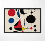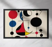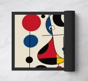 Een abstracte compositie met gedurfde geometrische vormen en primaire kleuren, zoals rood, blauw, groen en geel. Het arrangement bevat cirkels, lijnen en curven die een gevoel van beweging en balans creëren.