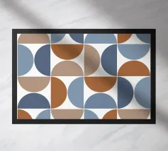Een repeterend geometrisch patroon met afwisselend rijen van halve cirkels en cirkels in de kleuren blauw en roest tegen een lichte achtergrond. Het ontwerp creëert een gevoel van ritme en beweging door de symmetrische opstelling.