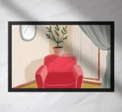 A red armchair is perfectly positioned by a window, with a mirror and a potted plant nearby. The scene is a quiet and peaceful invitation to sit and read, bathed in soft, natural light.