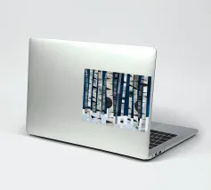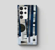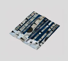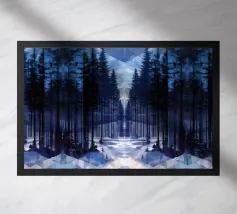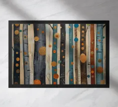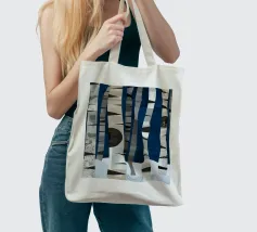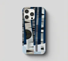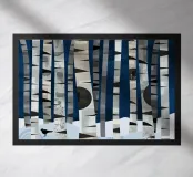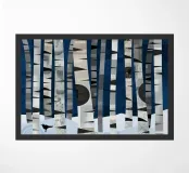 Hoge berkenbomen met opvallende zwarte en witte schors staan in een besneeuwd bos. Een kleine vogel laat sporen achter in de sneeuw onder het bladerdak van de boom. De scène is opgebouwd uit geometrische vormen en gedempte kleuren.