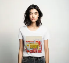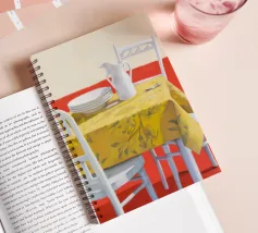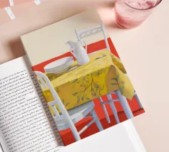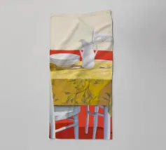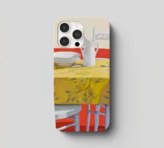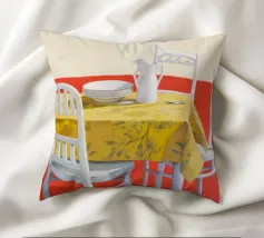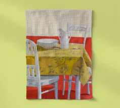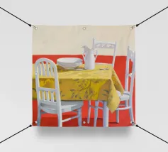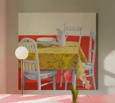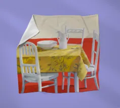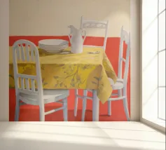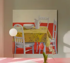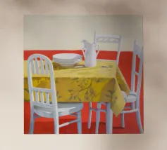 A simple, classic still life of a dining table with a yellow tablecloth, set with a plate and a pitcher. The composition is a serene, minimalist, and beautifully understated depiction of a waiting meal.