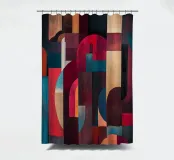 A rich, contemporary abstract composition built from layered geometric forms and deep, atmospheric colour. Curves and blocks intersect in a carefully balanced arrangement, creating a sense of architectural rhythm and visual depth. The surface texture adds a subtle, painterly warmth, softening the geometry and giving the work a tactile, crafted presence.