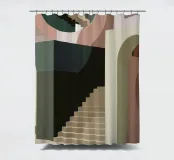 Een abstracte architecturale ruimte wordt gedefinieerd door een strakke trap en overlappende bogen, met een dramatisch spel van licht en schaduw dat een krachtige, minimalistische compositie creëert.