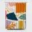Een abstracte collage van versplinterde, overlappende vormen in een levendig palet van oranje, blauw en roze creëert een dynamische, energieke en moderne compositie.