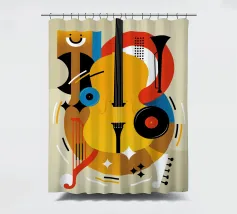 Een modern abstract schilderij met geometrische vormen die gitaren, violen en muzieknoten vormen in een gedurfde, kleurrijke compositie. De achtergrond met textuur en het dynamische arrangement roepen een gevoel van ritme en artistieke expressie op.
