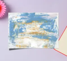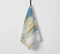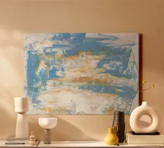 Dompel jezelf onder in de serene maar dynamische energie van deze abstracte kunstposter, met brede, gestructureerde streken van blauw, wit en warme aardetinten. De compositie roept een gevoel op van uitgestrekte luchten, kolkende oceanen of verweerde kustlandschappen, waarbij het samenspel van kleuren een kalmerend maar impactvol beeld creëert. Dit stuk biedt een moderne en artistieke esthetiek, perfect om een vleugje verfijnde rust en natuurlijke inspiratie toe te voegen aan elke ruimte. Onze digitale kunstreproductie heeft een ongelofelijke resolutie van 7000 x 5000 pixels bij 300 dpi, waardoor elke genuanceerde tint en ingewikkelde textuur is verzekerd.