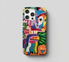 Een groep gestileerde menselijke figuren in een dynamische en kleurrijke omgeving. De overdreven gelaatstrekken en geometrische patronen roepen beweging en energie op.