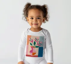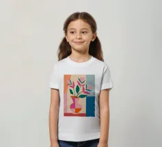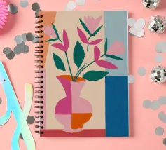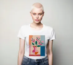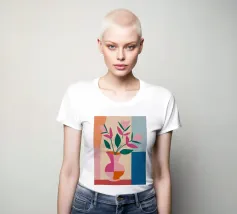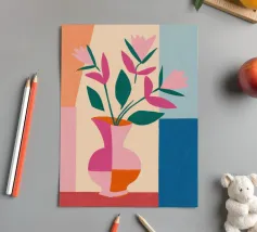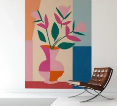 Een gestileerde illustratie van roze tulpen in een veelkleurige vaas. De abstracte vormen en het harmonieuze kleurenpalet van roze, oranje en groen creëren een modern en artistiek bloemenstuk.
