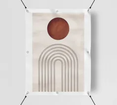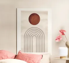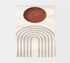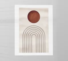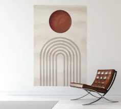 Dit abstracte ontwerp in warme aardetinten heeft een gestileerde zon boven een zacht boogpatroon dat een rustgevende en harmonieuze sfeer creëert. De minimalistische combinatie van ronde en lineaire vormen geeft elke kamer een moderne boho-esthetiek en straalt tegelijkertijd rust en helderheid uit. Als muurschildering, mok, kussen of mobiele telefoonhoes - dit motief is perfect voor liefhebbers van moderne, minimalistische kunst die een natuurlijke en stijlvolle toets aan hun huis willen geven. Ideaal voor de woonkamer, slaapkamer of kantoor.