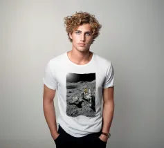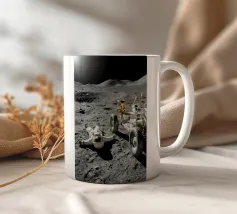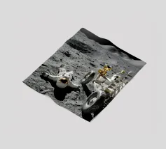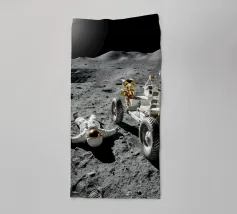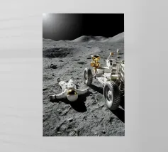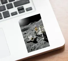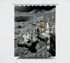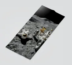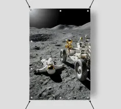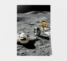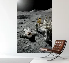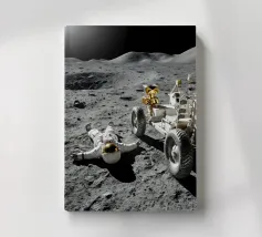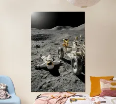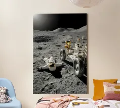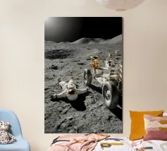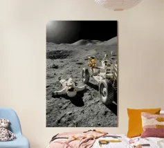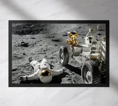 Ervaar een opvallende mix van realisme en verbeelding met dit fascinerende maan kunstwerk met een astronaut liggend op het maanoppervlak naast een gedetailleerde maanrover. Het ruige terrein, de diepe schaduwen en het zonlicht in de verte creëren een dramatische en meeslepende scène die de stille, surrealistische schoonheid van ruimteverkenning vastlegt. Dit ontwerp is perfect voor sciencefictionliefhebbers, avonturiers en fans van kosmische kunst en geeft elke kamer een gedurfd, futuristisch tintje. Een uniek stuk dat nieuwsgierigheid, verkenning en het wonder van het onbekende viert.
