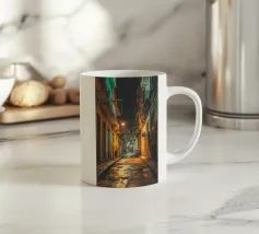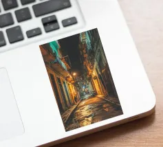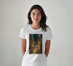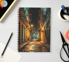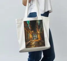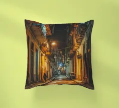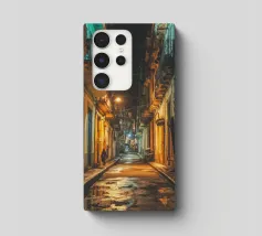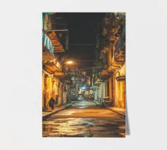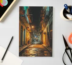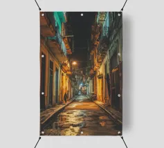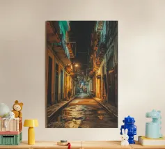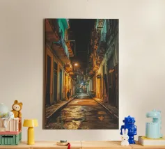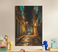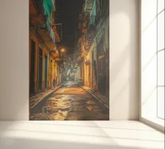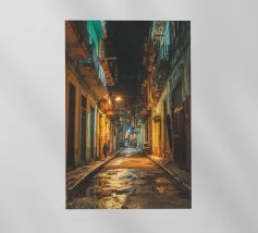Laat je verleiden door dit steegje dat baadt in gouden weerspiegelingen. Een fotografisch werk dat de rauwe schoonheid en sereniteit van Havana onder een sterrenhemel vastlegt.