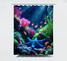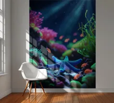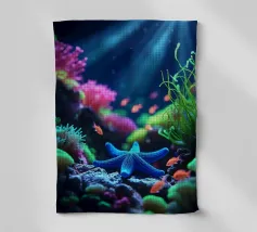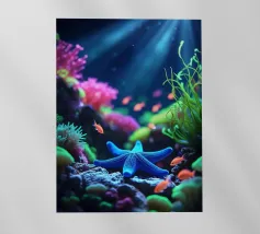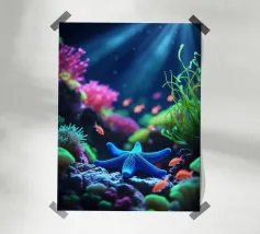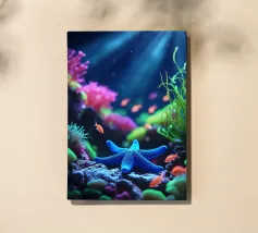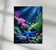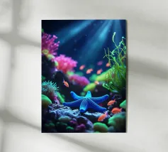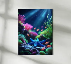 Een kobaltblauwe zeester rust tussen violette koralen en helder groen, terwijl het maanlicht door de golven erboven filtert. Vredig, geaard en gloeiend verankert het de magie van de nachtelijke zee. Uit de serie 'Nocturnal Depths ✦ Ocean After Dark'. Bedacht door LUMAQUA ✦ Gevisualiseerd met behulp van AI ✦ Ontdek onze kunst in echte interieurs - bekijk mockups op Pinterest: https://pin.it/2M90uciGa