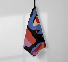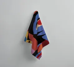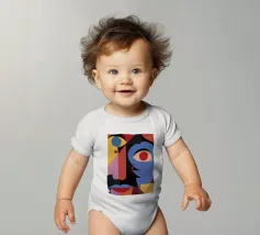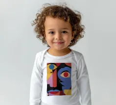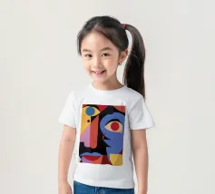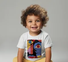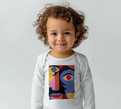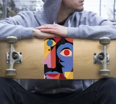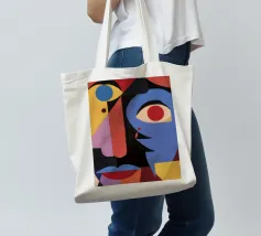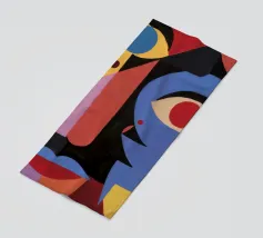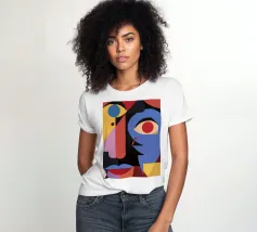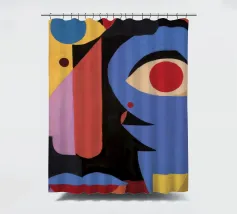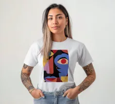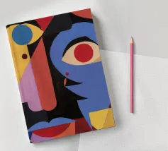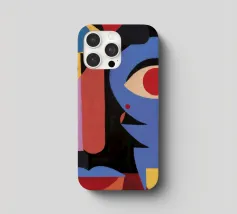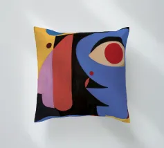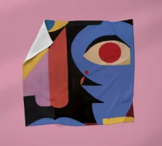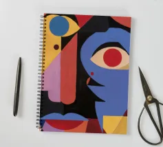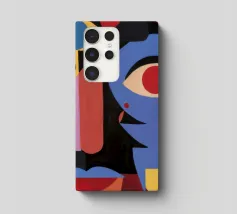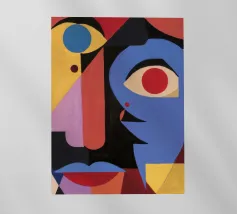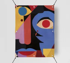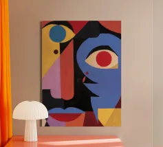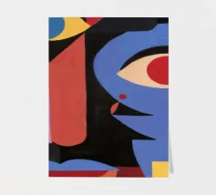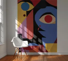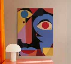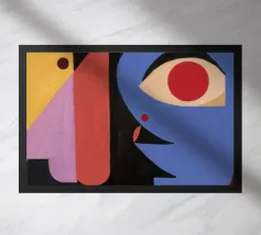 Een abstract portret van een gezicht, opgedeeld in gedurfde geometrische vormen en vlakken, voornamelijk in blauwe, rode, gele en zwarte tinten. Het oog is een prominent kenmerk, waardoor een intense en moderne artistieke expressie ontstaat.