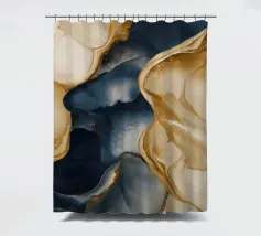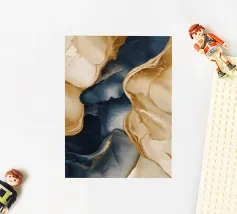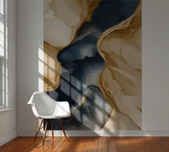 Amberkleurige en marineblauwe plooien gloeien met gouden aderen als sintels in steen.